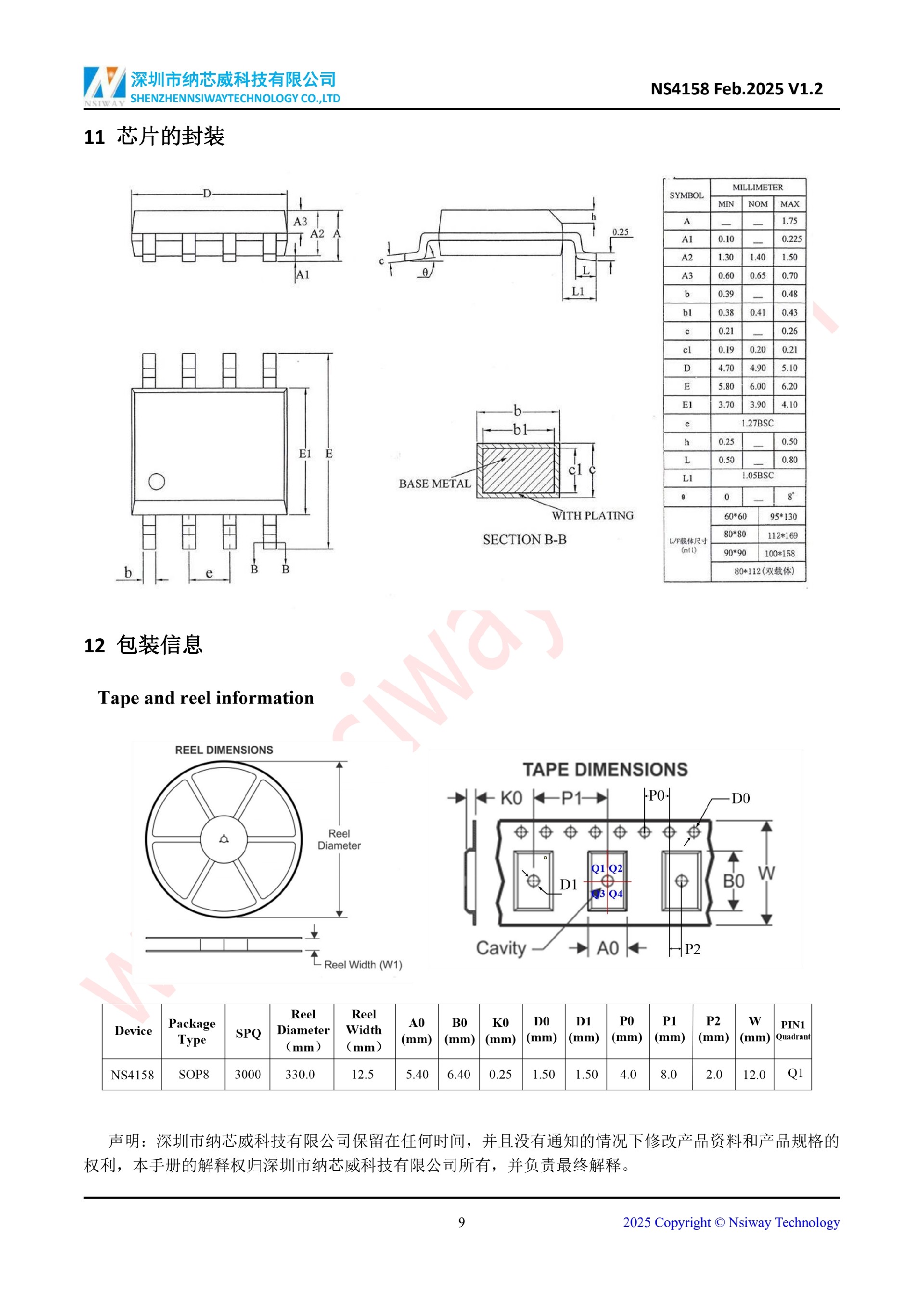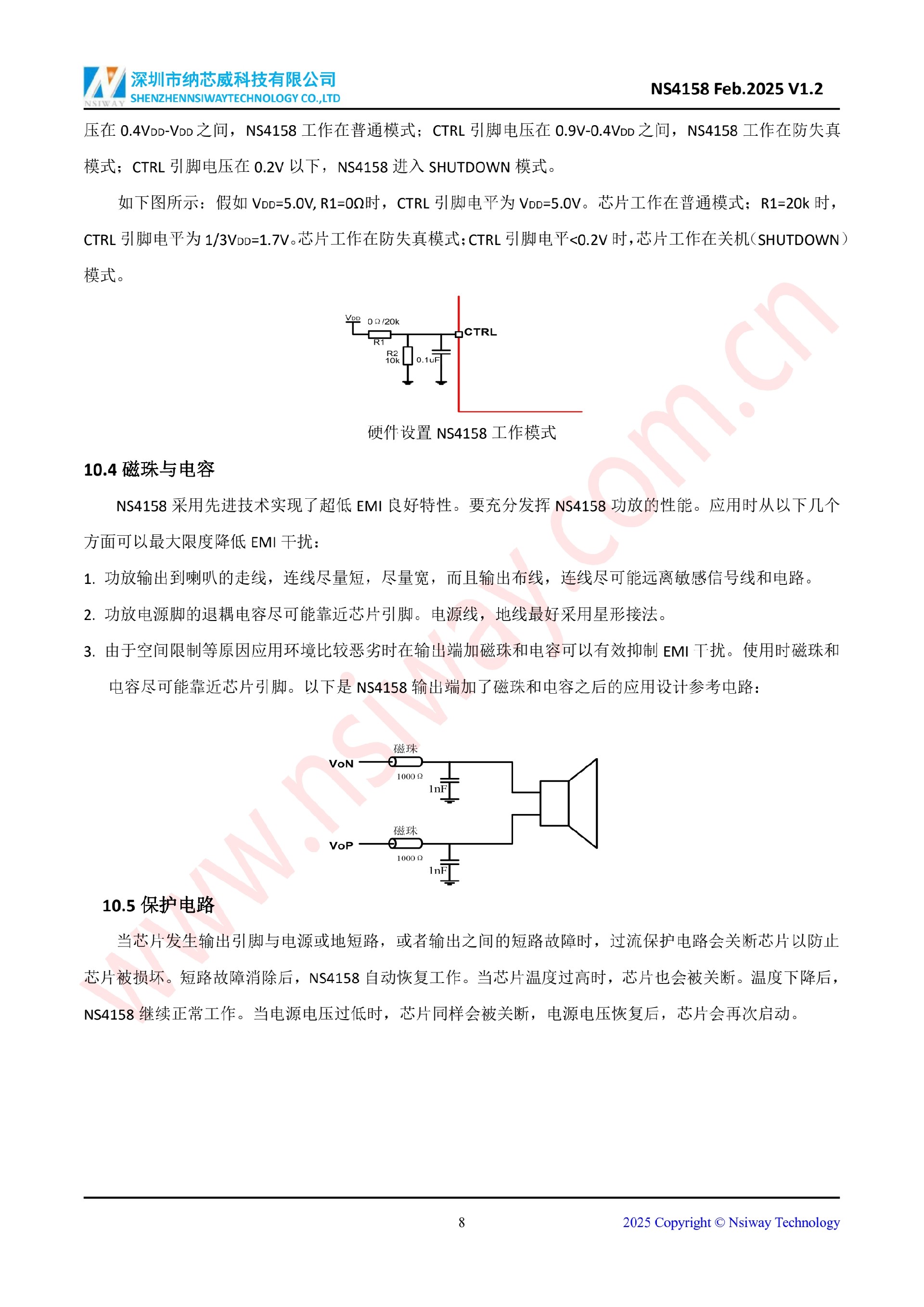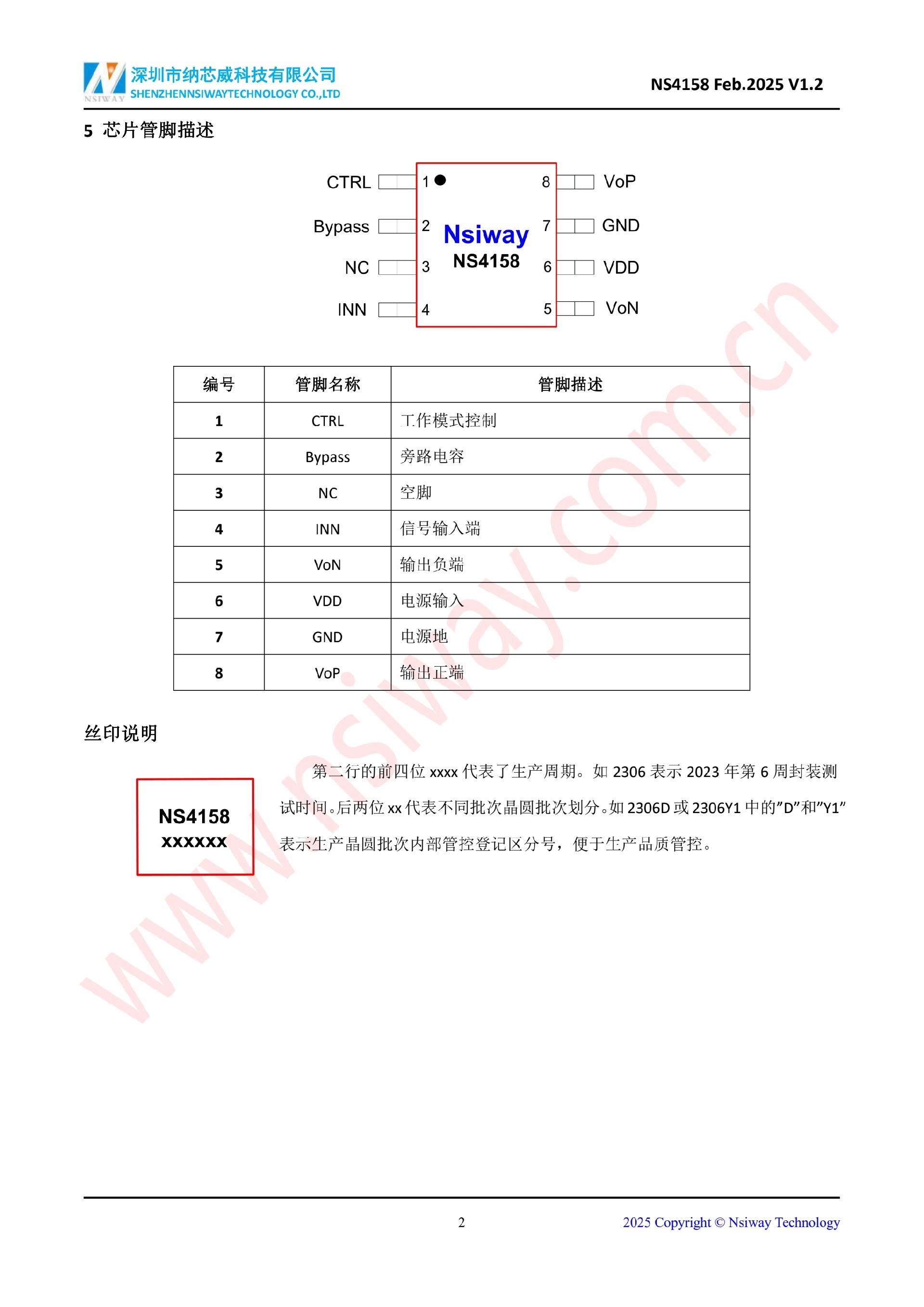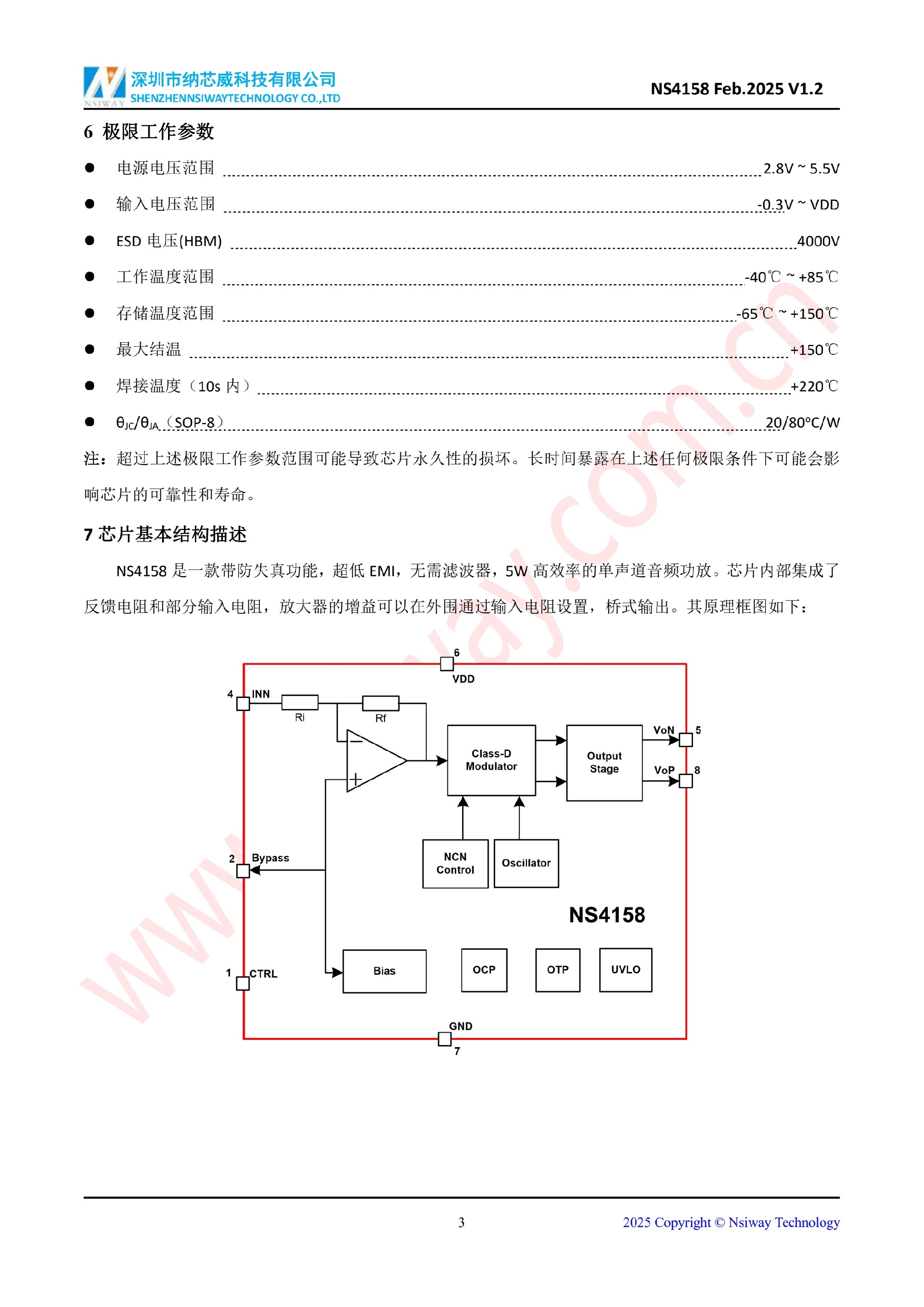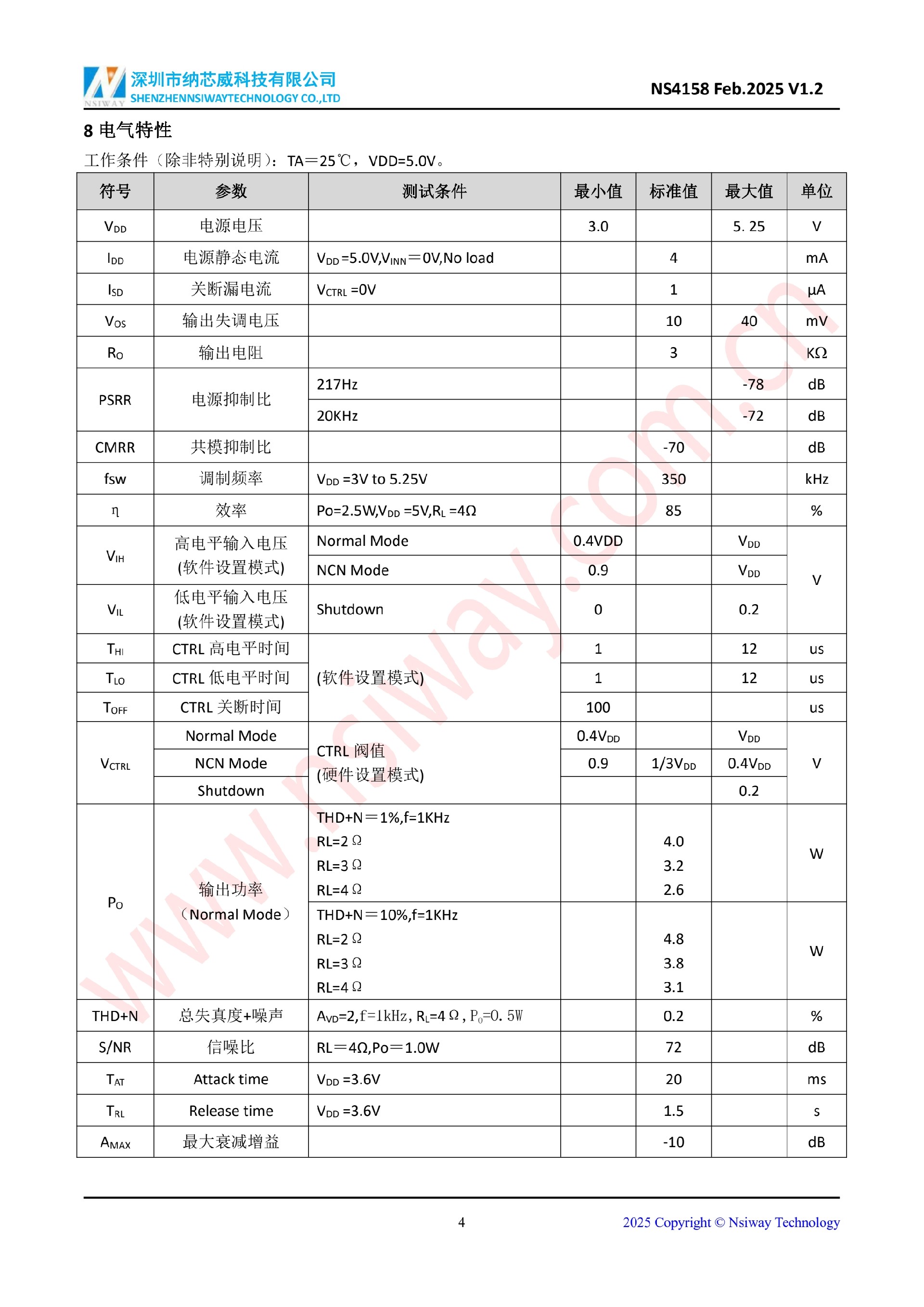 NS4158 5W 單聲道D類音頻功率放大器附加NCN防失真功能(SOP-8)